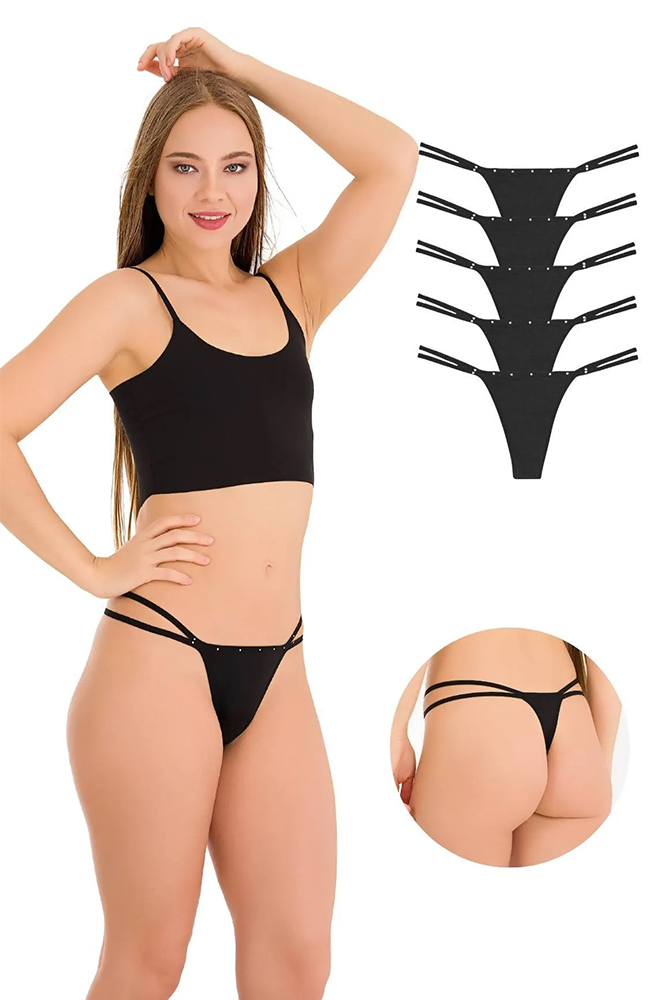 Γυναικείο βαμβακερό string κιλοτάκι με στρας στην μπροστινή μόνο όψη. Πακέτο 5 τεμαχίων. Σύνθεση: 95% Βαμβάκι, 5% Ελαστίνη