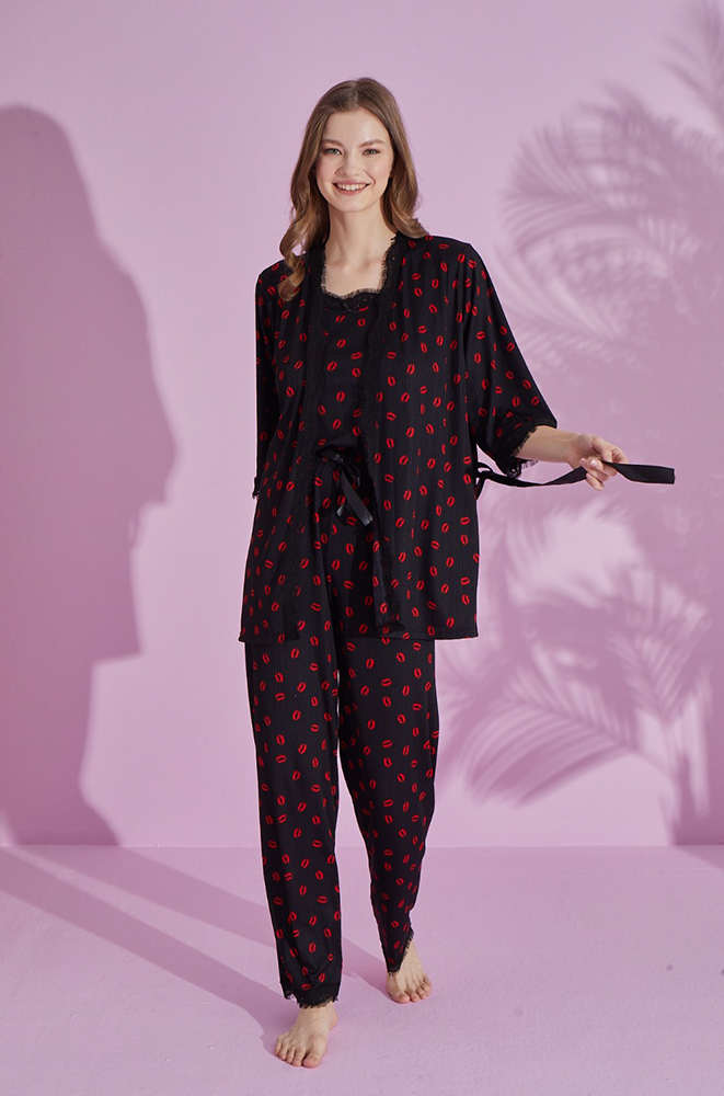 Γυναικεία πυτζάμα με ρόμπα. Η πυτζάμα αποτελείται από μακρύ παντελόνι, μπλουζάκι με ψιλή ράντα και ρόμπα η οποία δένει με ζώνη. Έχει δαντελένιες λεπτομέρειες στο τελείωμα και είναι ιδανικό για την περίοδο της άνοιξης και καλοκαιριού. Σύνθεση: 92% Μικροπολ, 8% Ελαστίνη