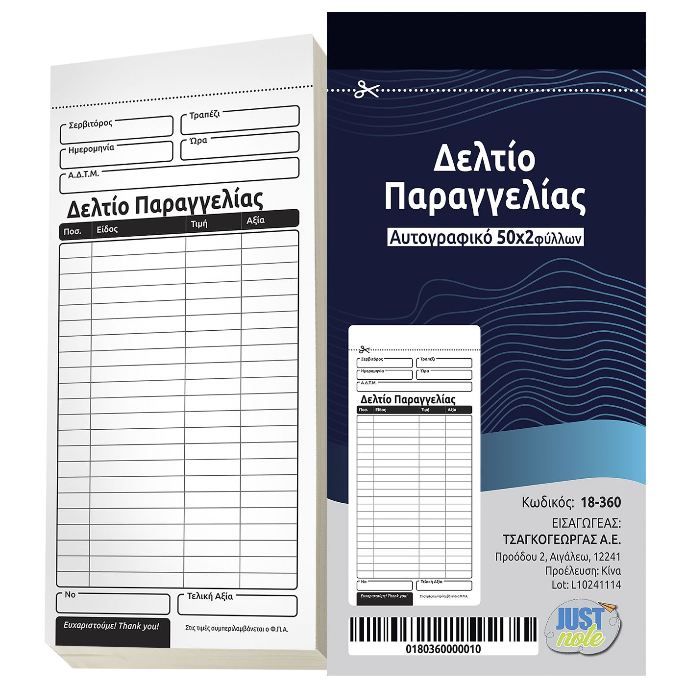 Μπλοκ Εστιατορίου Αυτογραφικό 2×50 Φύλλα 17,2×8,1cm JustNote 38380