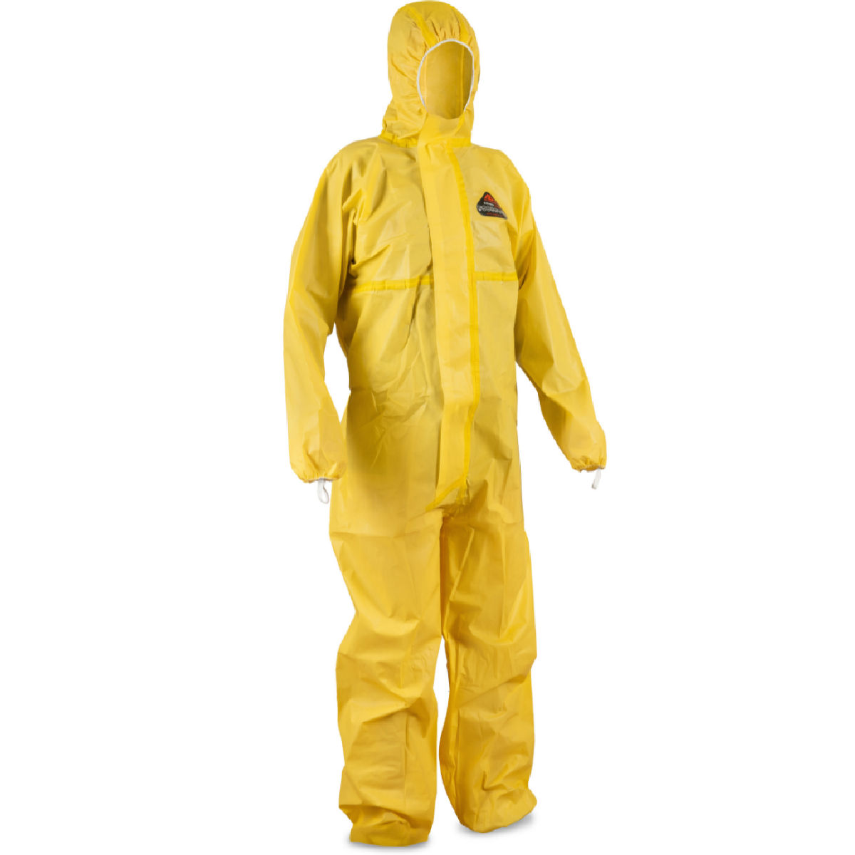 Η φόρμα χημικών Cover X590 XL σε χρώμα κίτρινο παρέχει προστασία υψηλής απόδοσης. Κατασκευασμένη από υλικό PP+PE με θερμοκολλημένες ραφές, εξασφαλίζει ασφάλεια και άνεση. Η ελαστική κουκούλα, οι ελαστικές μανσέτες και αστραγάλοι, καθώς και η ελαστική μέση, προσφέρουν άριστη εφαρμογή. Το κούμπωμα δαχτυλιδιού φερμουάρ με αυτοκόλλητο πτερύγιο και επιπλέον κάλυμμα λαιμού ενισχύει την προστασία.